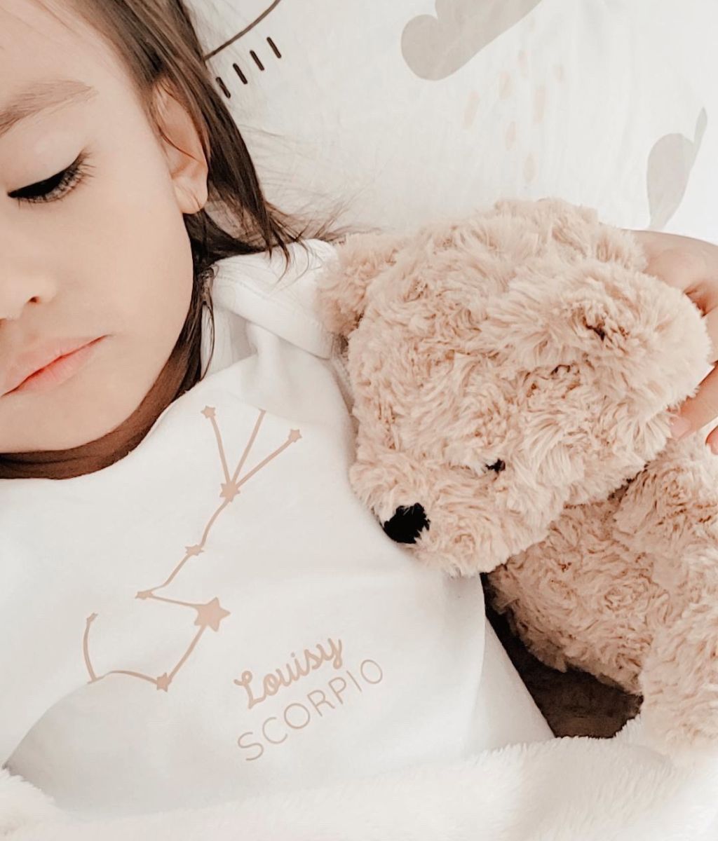 Dieser Body aus Bio-Baumwolle ist eine wunderbare Geschenkidee zur Geburt. Personalisieren Sie diesen kleinen Body mit dem Vornamen, dem Sternzeichen und dem dazugehörigen Sternbild Ihres Babys.