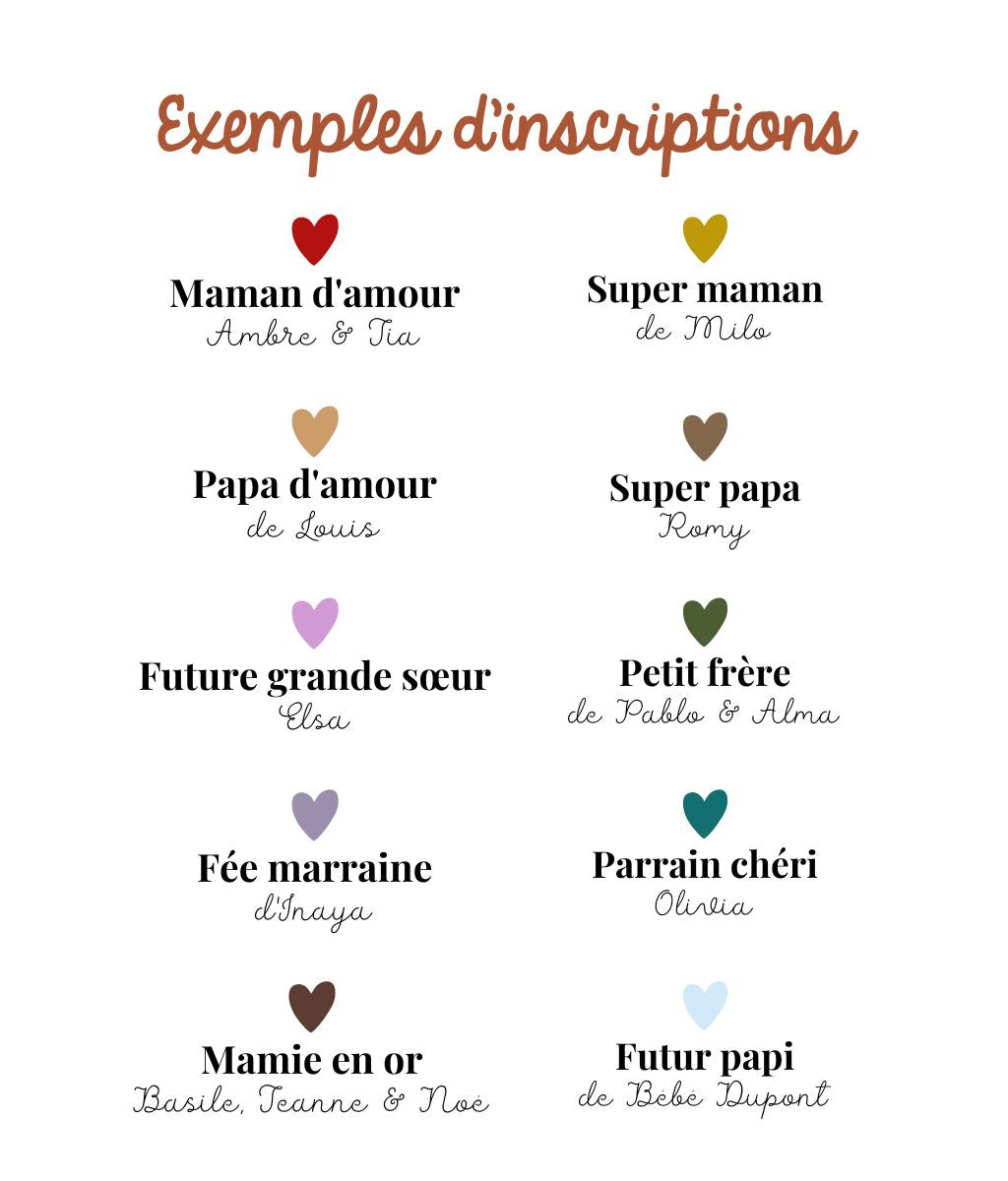 Beispiele für Aufschriften: Liebende Mutter / Goldener Papa / Großer Bruder / Liebste kleine Schwester / Super-Oma / Liebster Opa / Pate / Gute Fee ...