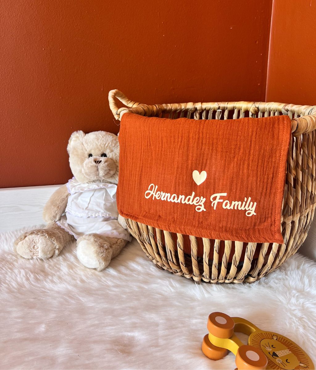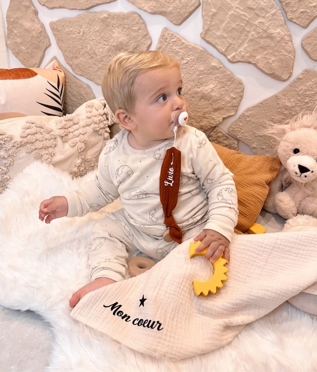 Ideal for a birth gift, this swaddle available in different colors can be personalized with baby's first name or with a sweet little word and a pattern of your choice. The chosen text will be written on one of the four corners of the diaper.