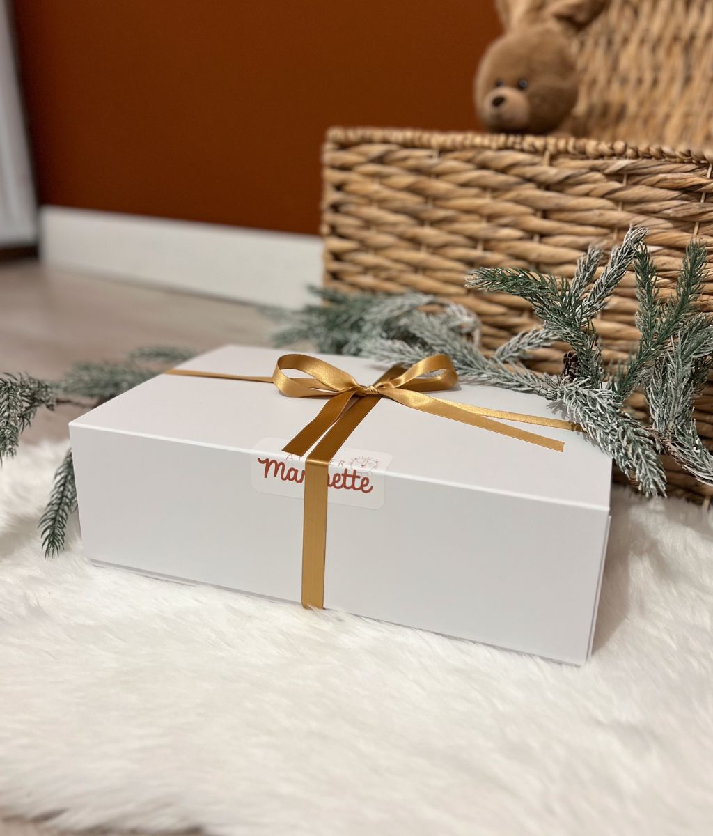 Ce coffret cadeau pour bébé est entièrement personnalisable avec le prénom de bébé, un mot doux et un motif, et tout ça gratuitement !