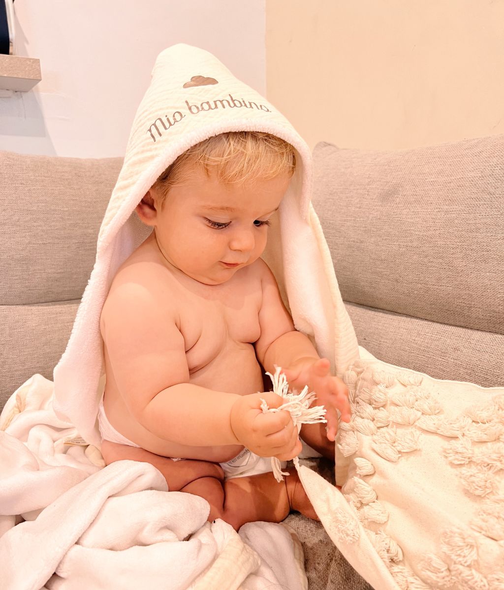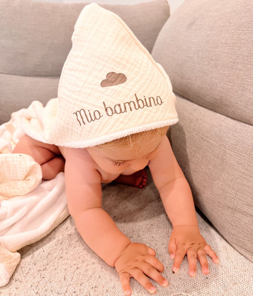 Our bath cape will accompany your child during their first year from the moment they get out of the bath or even after a dip in the pool or sea water. Thanks to its very soft bamboo sponge, it is up to 4 times more absorbent than a bath cape with cotton sponge.