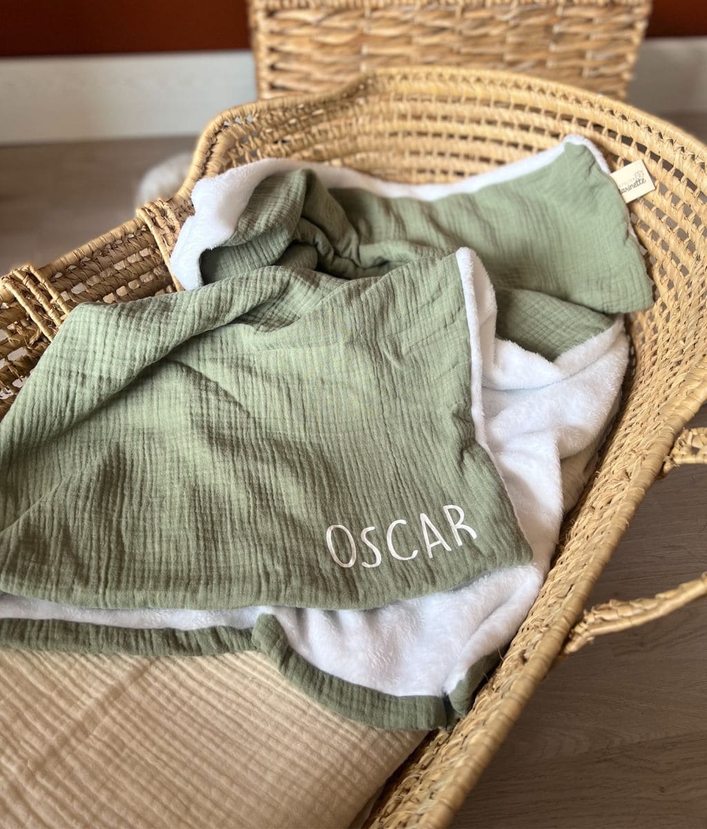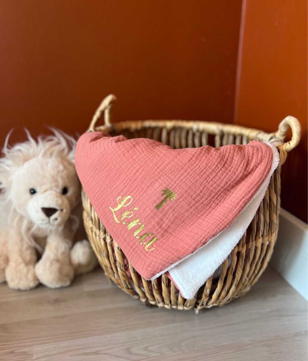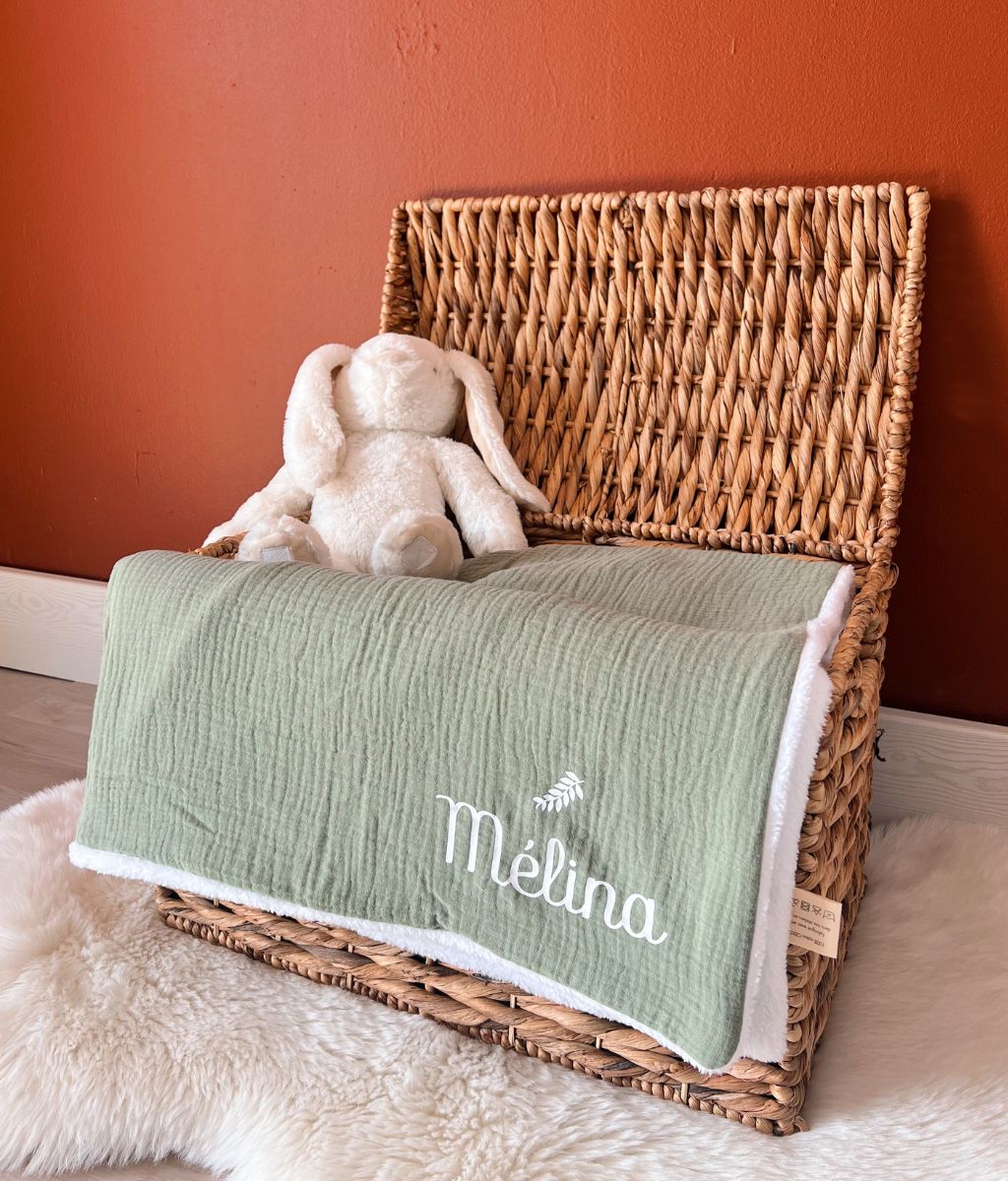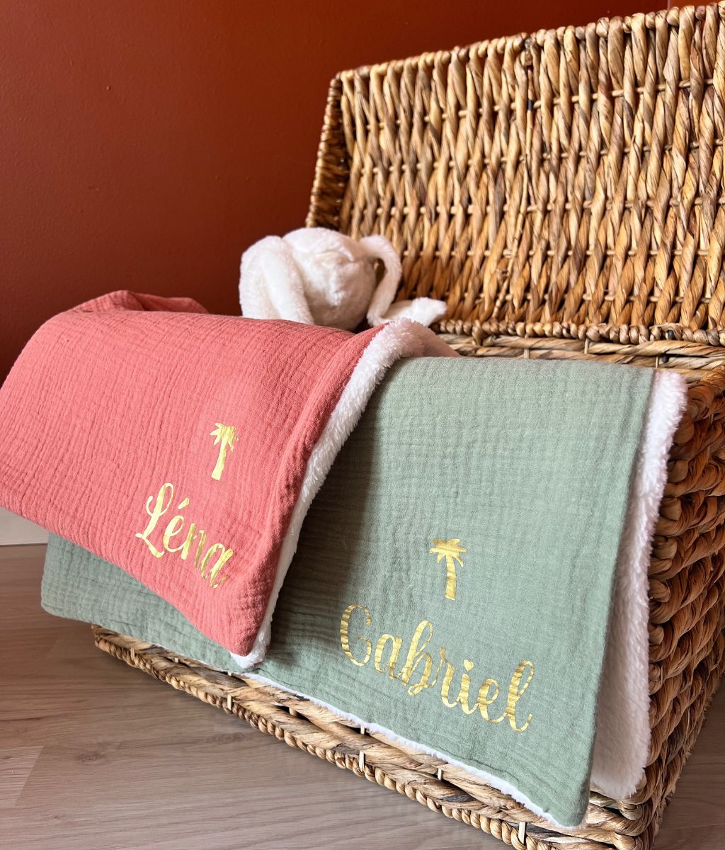 Our cotton gauze and cozy fleece blanket can be personalized with a sweet little note or baby's first name. A great idea for a gift made in France for babies to offer in all circumstances: birth, birthday, religious celebration, baby shower…
