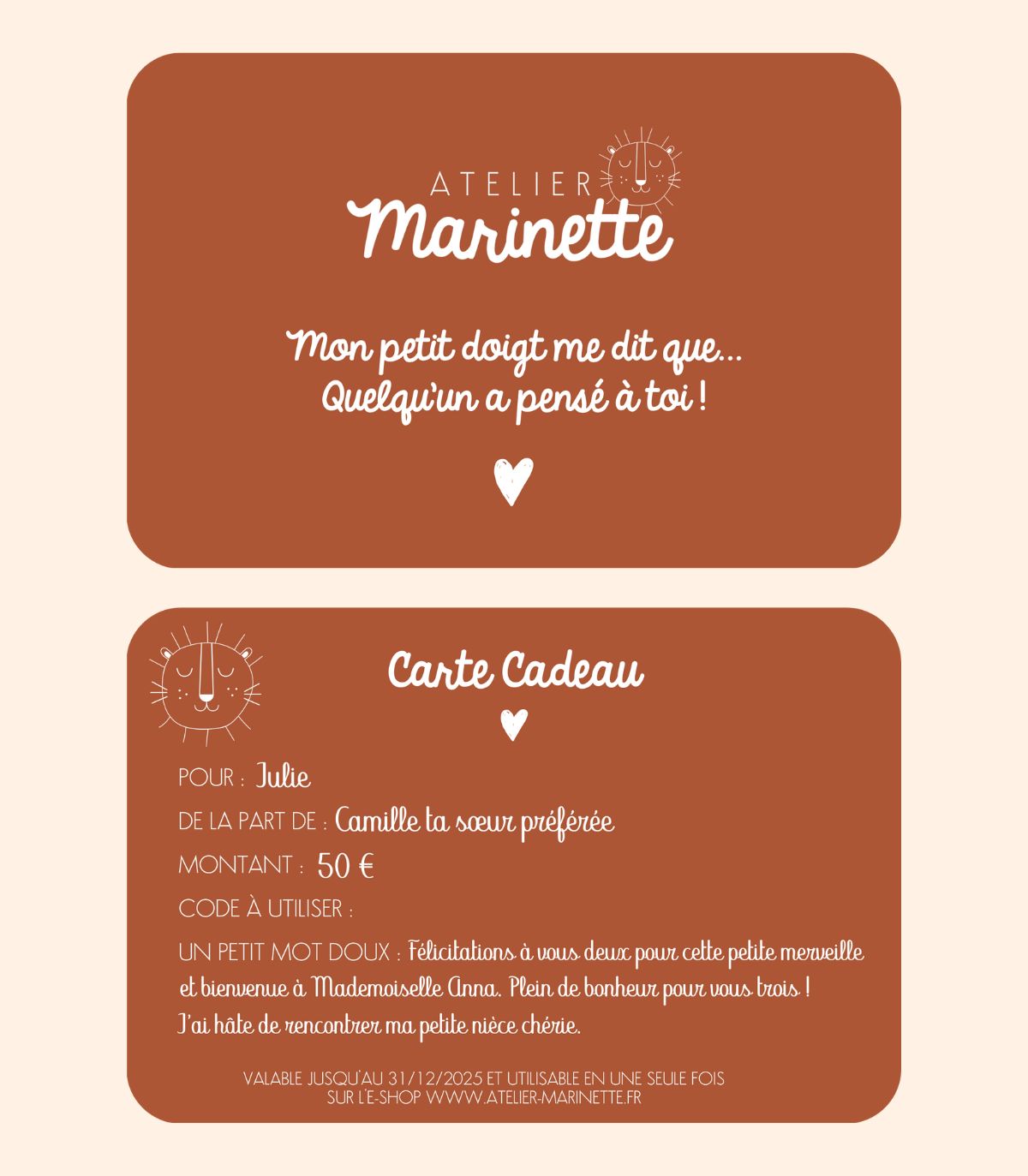 À l'occasion de la naissance à venir de votre petite puce, Camille vous offre une carte cadeau d'un montant de 50€ à valoir sur notre e-shop : www.atelier-marinette.fr pendant un an, à compter d'aujourd'hui, sans minimum d'achat et utilisable en une seule fois.